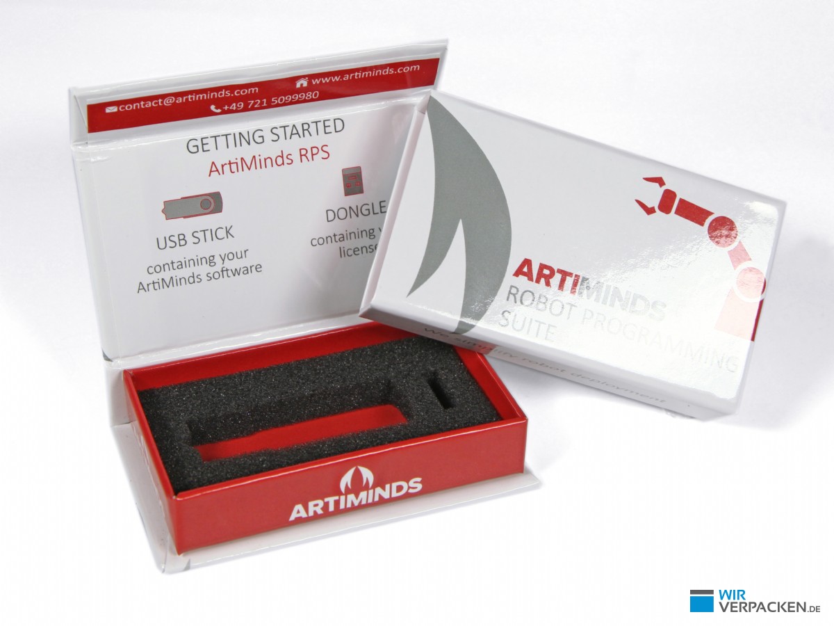 Hergestellt aus 2 mm Feinkartonage, kaschiert mit einem CMYK Aufdruck. Der Innenkarton wurde in rot gehalten, so dass ein Kontrast zur weißen Farbe entsteht. Unsichtbare Magnete halten die Dongle-Verpackung sicher verschlossen. Inlay aus Schaumstoff, passend zum Produkt geschnitten.